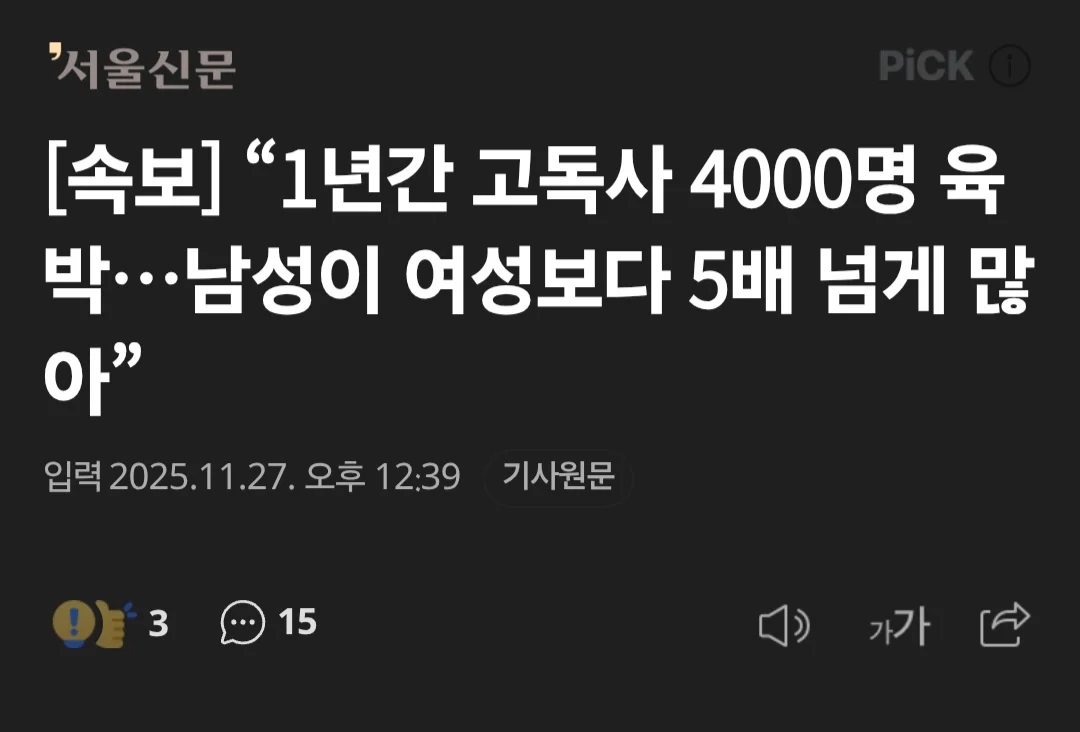 연간 고독사 4,000여건.. 남성이 여성보다 5배 많아