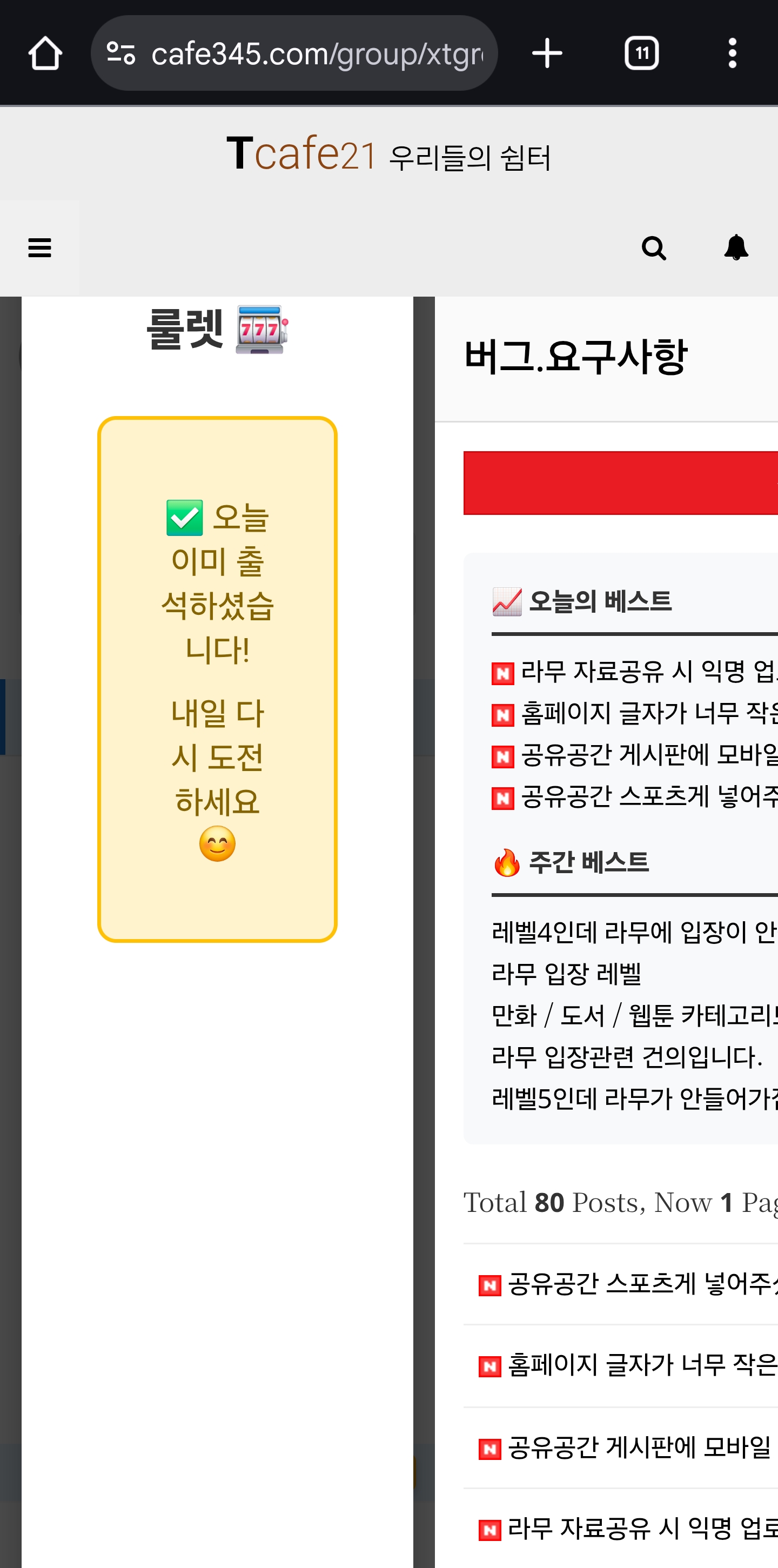 우선 출석하기 누르면 메뉴 누른화면에서 리스트(내용)부분의 화면이 바뀌어야 될듯한데 메뉴부분의 화면이 바뀌는 현상이 있습니다.
