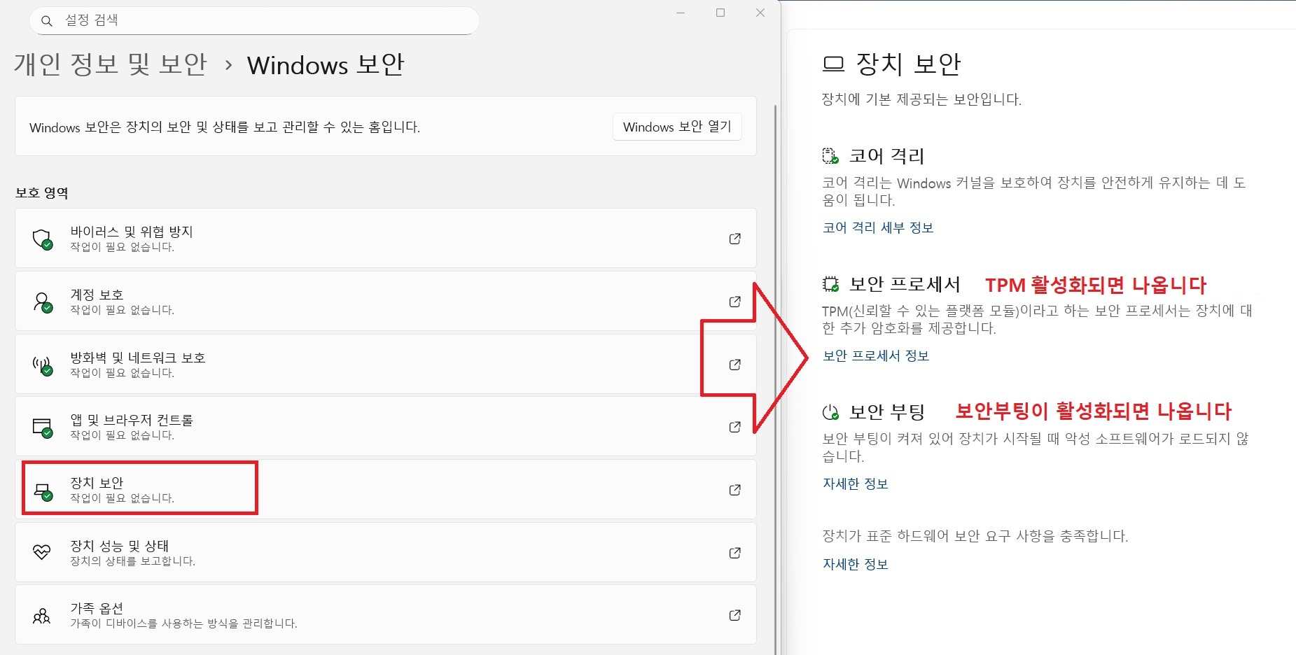 - 윈도우검색창에 "장치 보안" 으로 열어보셔도됩니다.
