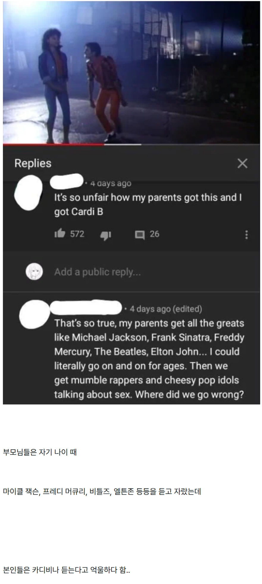 제 고등학생 아들도 8-90년대 노래 좋아해요 중고등학교 밴드 하며 느낀게 요즘 노래들은 대부분 획일화 되어있고 의미없는 가사가 많은 반면에 80년대 노래는 가사가 좋고 90년대 음악은 다양한 시도와 장르를 뛰어넘는 신선함과 낭만이 있어 좋다는군요 그렇지만 중학생 딸은 요즘 아이돌 노래만 듣습니다 ㅋㅋ