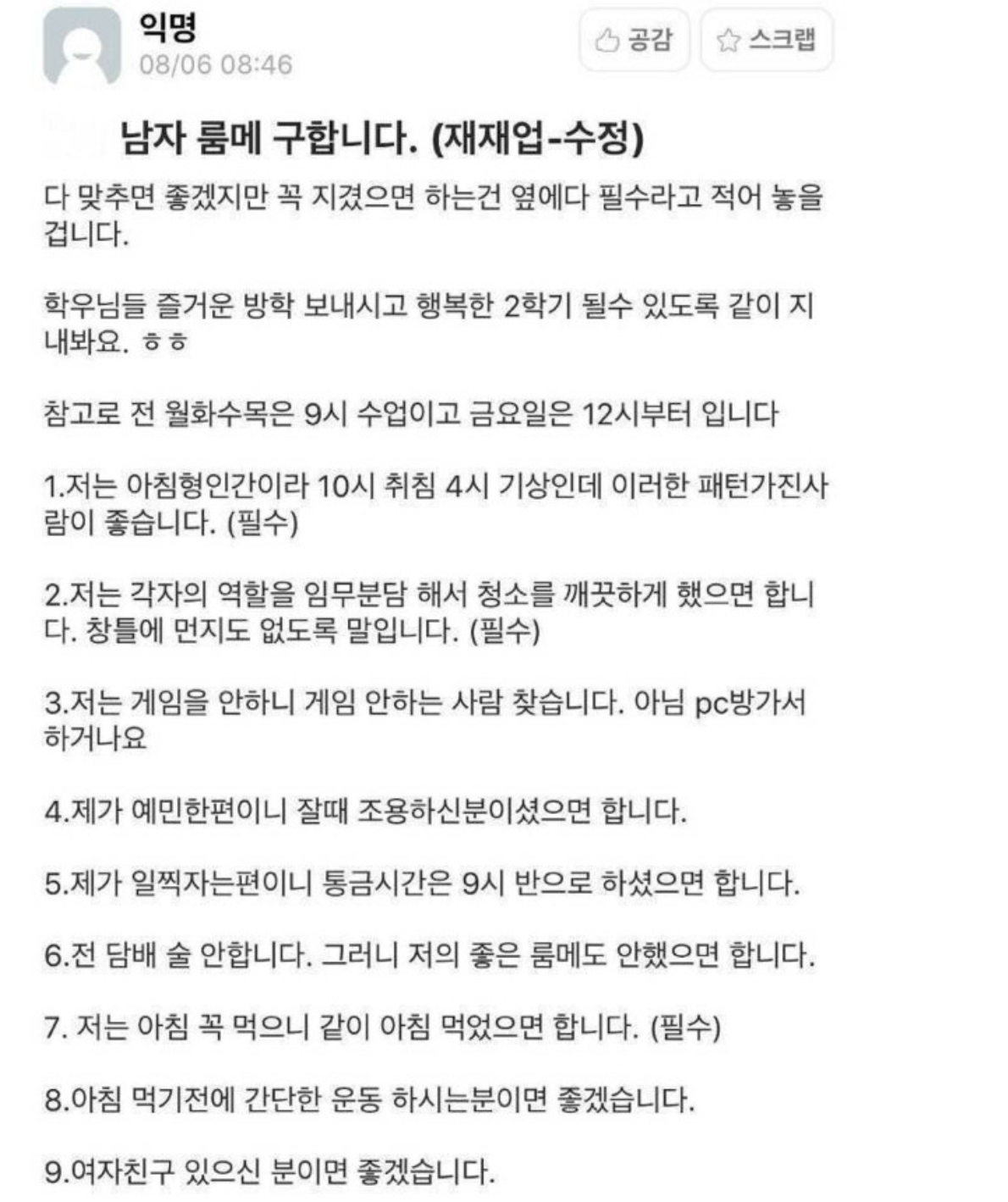 룸메를 왜 찾지? 혼자 살아야 될 팔자인데?